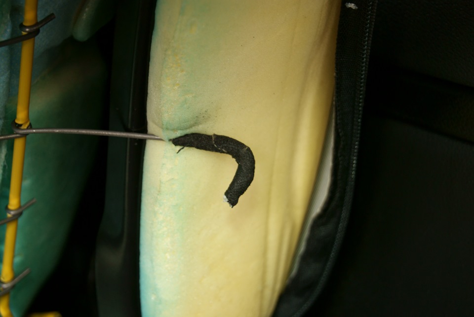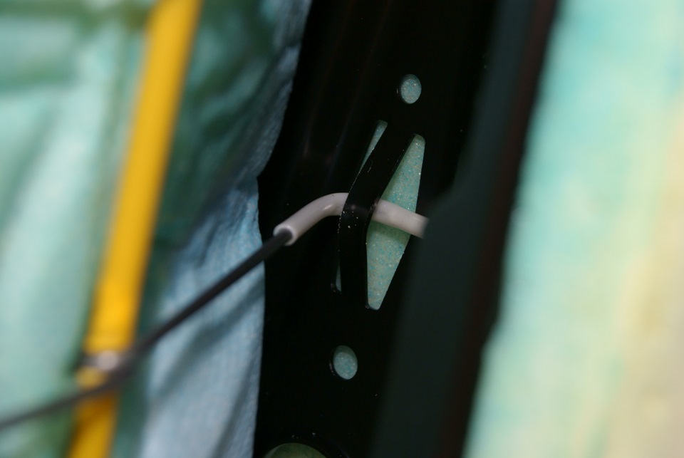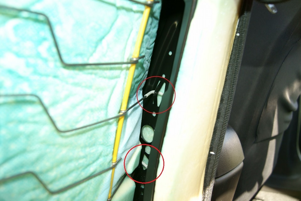 — Звук появлялся из-за того, что пластиковая трубка под передним пассажирским сиденьем, в которой проходит провод обогрева, на неровностях бьется об металлическую растяжку. Приматываем трубку изолентой к растяжке.