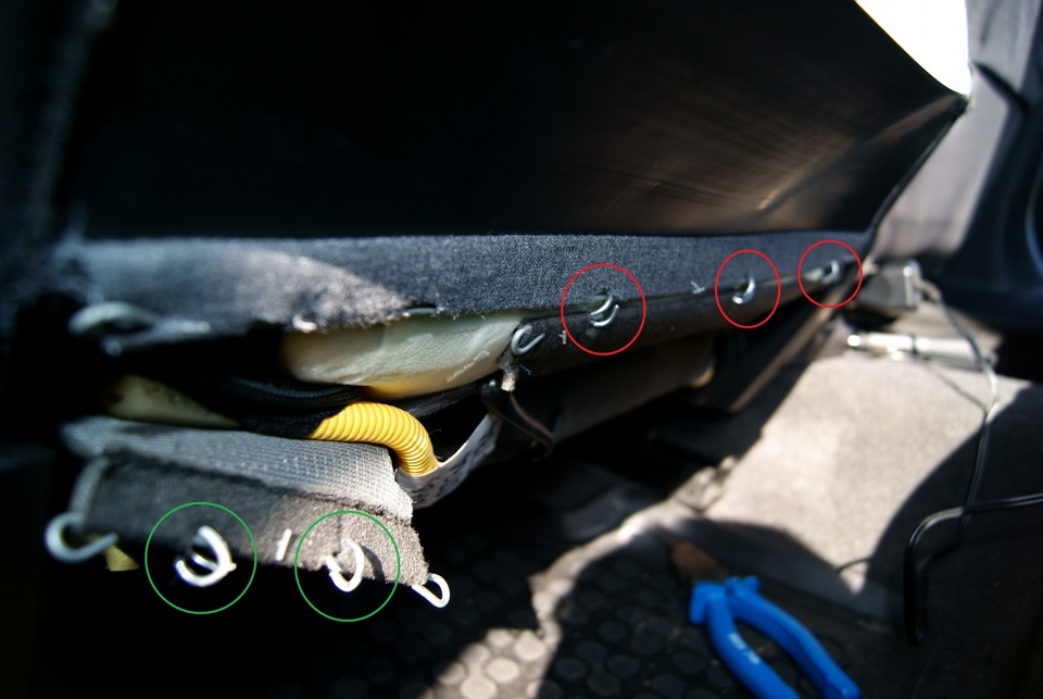 2. Приподняв кусок материала, видим ряд металлических колец, скрепляющих 2 части обивки. С помощью двух плоскогубцев разводим кольца в разные стороны, чтобы появилась возможность высвободить верхнюю часть обивки: