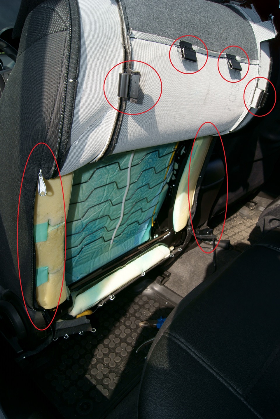 3. Находим 2 молнии по бокам. Они очень тугие, поэтому тянем вверх с усилием. После открытия молний, отщелкиваем еще 4 крючка и поднимаем вверх обивку. Ура! Мы добрались до внутренностей:
